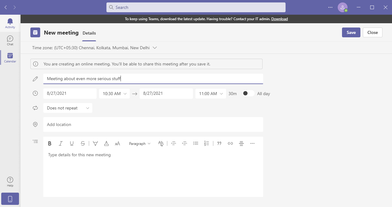 You can also schedule video conferences well in advance from the Calendar section. To get started, select Calendar > New Meeting. Once in, set the Title, Date, Location, and, last but not the least, the details about your meeting. You can also manage the Time zone of your meeting as per your requirements.