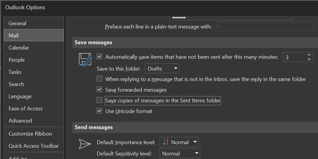 - Here, you’ll find an option that says Save copies of messages in the Sent Items folder. Untick this option.