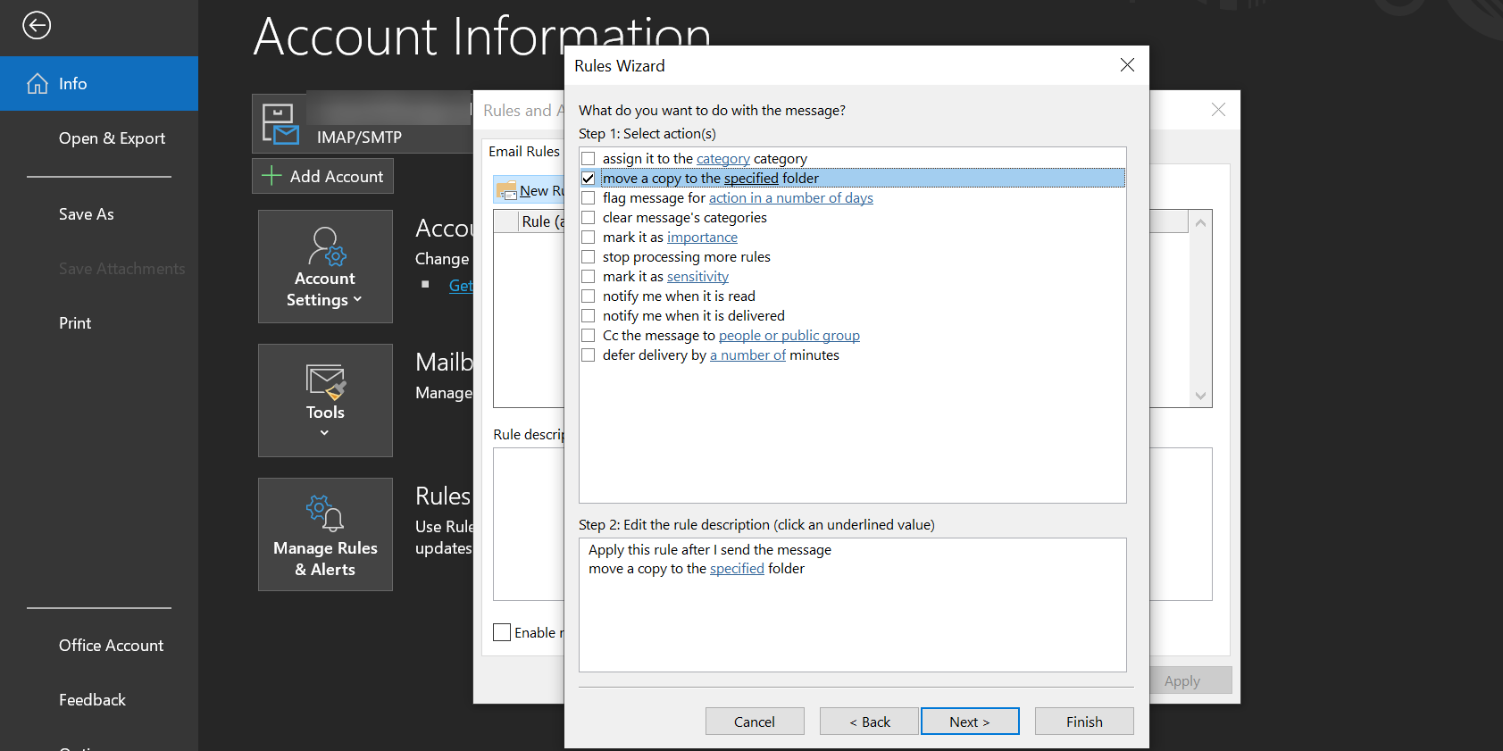 This requires you to create a rule in Outlook that sends all your sent emails to your specified folder. Here’s how to create this rule in Outlook: