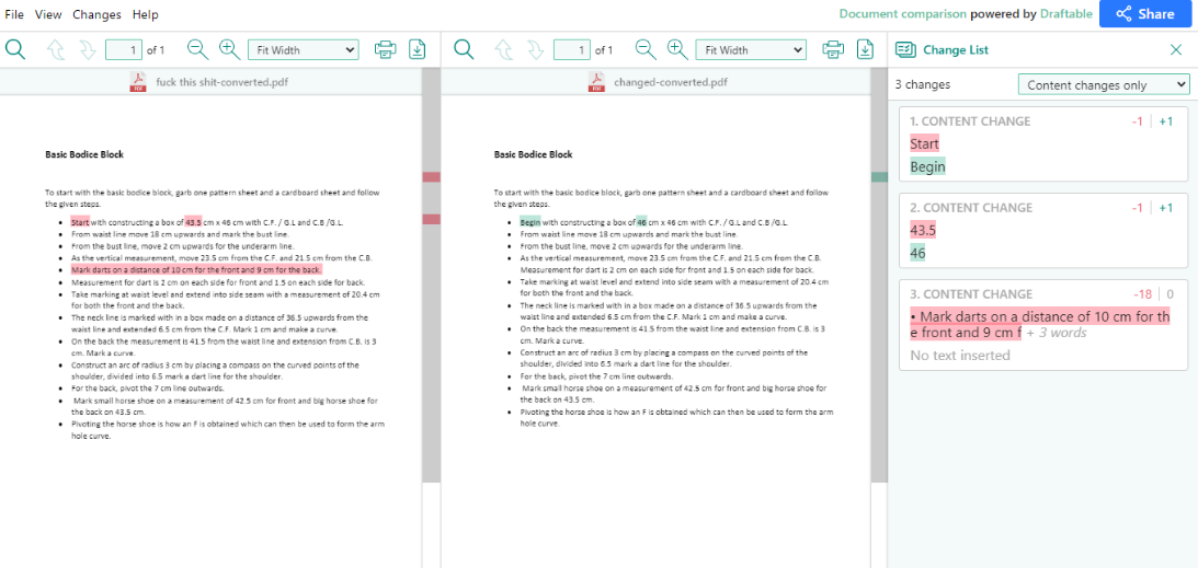 Comparing two documents to find possible changes is a very exhausting and time-consuming process. Several rounds of revision in a document can make changes slip by.