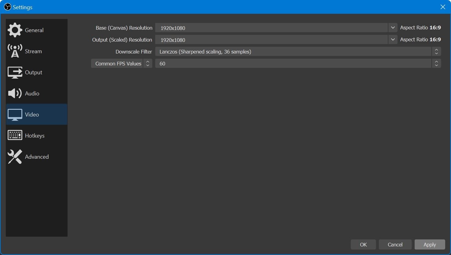 - Additionally, set the Downscale Filter to Lanczos and make sure the FPS value is set to 60 too. Finally, click on Apply to save all your changes.