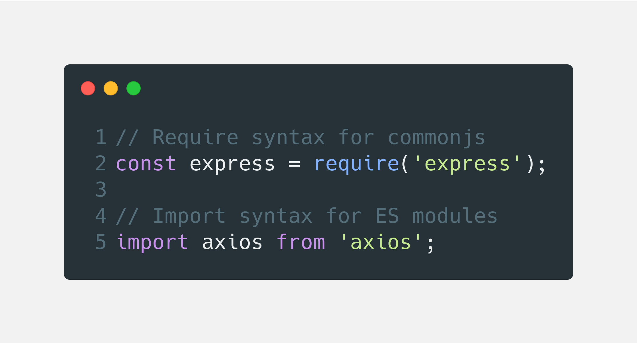 To use the installed packages, you’ll have to require or import them into your JavaScript code. The syntax for doing so can be either of these two commands depending on the version of JavaScript you’re using: